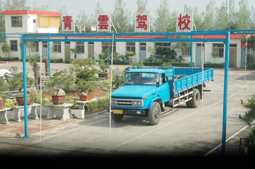 在城北两公里处有占地150亩的大型教考场,建有全硬化训练车道46000平方米,设九大科目的训练设置,备有龙骨架14架、电子桩考试仪两架,供学员练习与考试使用。有获得省交通厅考核合格证的教练员40名、另有待培训的12名,理论教师2名;有教练车43部,其中大车6部,桑塔纳25部,皮卡13部;理论学习采用多媒体教学,有专职理论教师任教。微机室两口,微机60台,供学员上机练习;有模拟驾驶仪6台、透明车体模型等先进教学实习设备。